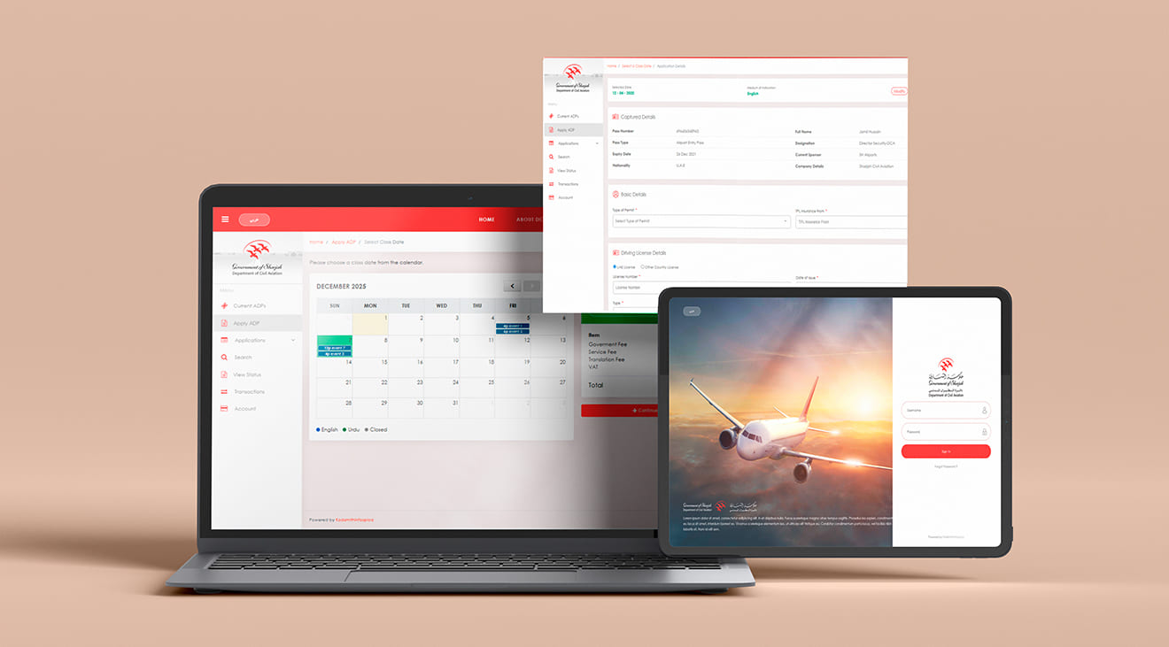 A multilingual pass management platform for the Sharjah Aviation Department, allowing users to apply for ground, driver, vehicle, photography and other access permits, along with mandatory training courses. I led the UI/UX and frontend development for the applicant portals and the role-based dashboards used by police, gate officers, finance teams, and system administrators.